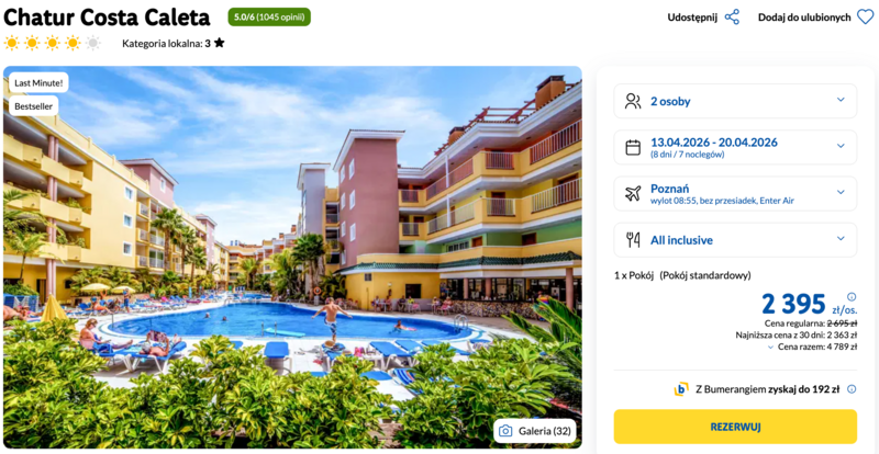 Wycieczka do Hiszpanii pozwala cieszyć się urokami miejscowości Caleta de Fuste, gdzie szeroka, zatokowa plaża zachęca do długich spacerów. Zakwaterowanie odbywa się w odświeżonym hotelu Chatur Costa Caleta, który zbiera świetne opinie dzięki wyjątkowej atmosferze oraz smacznym posiłkom serwowanym w bogatej opcji all inclusive. Uczestnicy wyjazdu podkreślają profesjonalizm obsługi oraz doskonałą strefę rekreacyjną z basenami, w tym specjalnym tarasem na dachu przeznaczonym wyłącznie dla dorosłych. W cenie pobytu zapewnia się pełne wyżywienie, lokalne napoje oraz szeroki program animacyjny obejmujący muzykę na żywo i ciekawe pokazy.