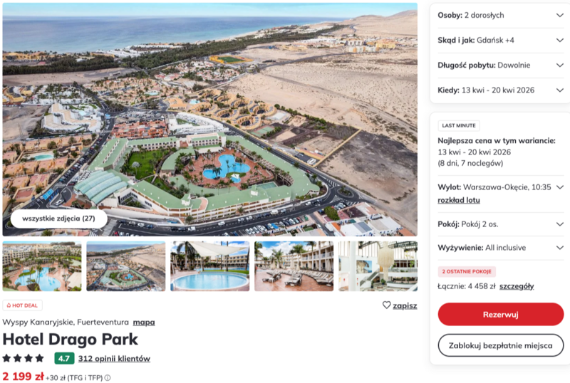 Wiosenny termin gwarantuje doskonałą pogodę z temperaturami sięgającymi 24 stopni Celsjusza, co sprzyja korzystaniu z uroków szerokich, piaszczystych plaż w miejscowości Costa Calma. Turyści chwalą czystość oceanu oraz krystaliczną wodę, idealną do uprawiania sportów wodnych. Dla chętnych dostępne są liczne atrakcje, jak wycieczki na sąsiednią wyspę Lanzarote czy wizyta w Parku Naturalnym Wydm Corralejo. To wyjątkowe miejsce pozwala w pełni oderwać się od codziennej rutyny.