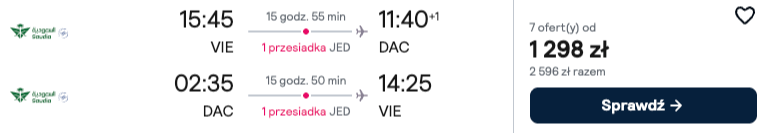 To wyjątkowe zestawienie połączeń realizowane jest przez linie lotnicze Saudia z międzylądowaniem w Dżuddzie. Czas spędzony w podróży jest zoptymalizowany i wynosi średnio niecałych szesnaście godzin, co czyni tę ofertę niezwykle atrakcyjną na tle innych przewoźników. Takie budżetowe bilety lotnicze to doskonała okazja, aby odwiedzić Dhakę, korzystając z nowoczesnej floty i wysokiego standardu obsługi pasażera.
