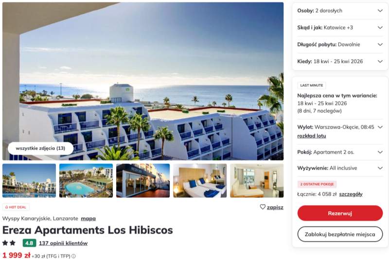 Ten dedykowany wyłącznie dla dorosłych obiekt Ereza Apartaments Los Hibiscos zbiera dobre opinie za swoje położenie w sercu Puerto del Carmen oraz niezwykle przyjazną obsługę. Użytkownicy chwalą przestronne apartamenty z aneksami kuchennymi oraz bliskość piaszczystej plaży i tętniącej życiem promenady. Jest to miejsce doceniane przez osoby pragnące spokoju, gdyż brak głośnych animacji pozwala na pełen relaks przy basenie otoczonym zadbanym ogrodem. Wyjazd odbywa się w opcji all inclusive, co zapewnia nielimitowany dostęp do lokalnych specjałów, pysznych ryb oraz orzeźwiających napojów bez żadnych dodatkowych zmartwień o wyżywienie.