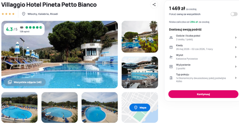 Wypoczynek w czterogwiazdkowym obiekcie Pineta Petto Bianco w Ricadi to gwarancja relaksu w otoczeniu bujnej zieleni. Goście w swoich opiniach podkreślają serdeczność obsługi oraz niezwykle rodzinną atmosferę, która sprawia, że pobyt staje się niezapomnianym przeżyciem. Dużym uznaniem cieszy się malownicze położenie hotelu na wzgórzu, skąd rozpościera się widok na okolicę, a bezpłatny autobus sprawnie dowozi plażowiczów nad brzeg morza.
