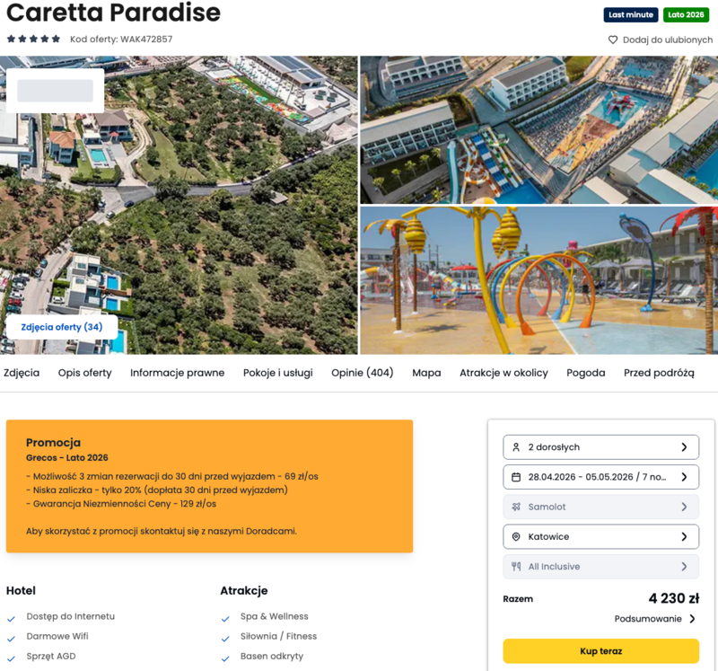 Wyjątkowy obiekt Caretta Paradise, położony w malowniczej miejscowości Tragaki, oferuje standard czterech gwiazdek i nowoczesny design. Goście doceniają kaskadowe położenie hotelu oraz bogate zaplecze rekreacyjne, w tym nowoczesny aquapark z licznymi zjeżdżalniami, który jest dostępny bezpłatnie. Cały pobyt jest realizowany w formule all inclusive, co zapewnia nielimitowany dostęp do lokalnych napojów, przekąsek oraz głównych posiłków serwowanych w restauracji głównej i lokalach tematycznych z kuchnią grecką czy włoską.