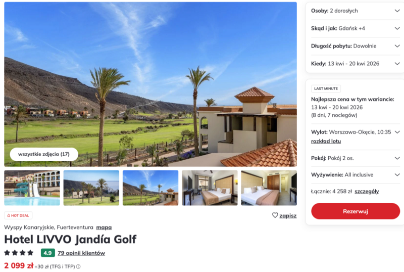 Wczasy w czterogwiazdkowym Hotelu LIVVO Jandía Golf przyciągają turystów pragnących wypoczynku w spokojnej okolicy, tuż przy profesjonalnym polu golfowym. Obiekt oferuje przestronne, niedawno odnowione pokoje oraz dwa baseny, w tym jeden podgrzewany. Goście chwalą w opiniach smaczne posiłki oraz miłą obsługę. Pobyt realizowany jest w formule all inclusive, co gwarantuje pełne wyżywienie, przekąski oraz lokalne napoje w cenie.