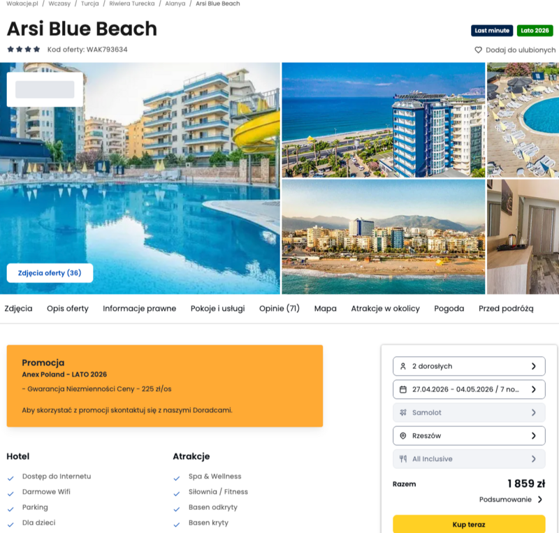 Odpoczynek zaplanowano w czterogwiazdkowym obiekcie Arsi Blue Beach, który położony jest w malowniczej okolicy Alanyi, zaledwie kilkadziesiąt metrów od piaszczystej plaży. Na miejscu dostępny jest basen ze zjeżdżalnią oraz nowoczesne zaplecze spa, co sprzyja regeneracji sił. Podkreślić należy, że cały wyjazd odbywa się w formule all inclusive, zapewniającej pełne wyżywienie w formie bufetu oraz nieograniczony dostęp do lokalnych napojów. Odwiedzający chwalą ten obiekt za bardzo smaczne jedzenie, czystość w pokojach oraz bliskość licznych restauracji i barów, co czyni go świetną bazą wypadową dla osób lubiących spacery.