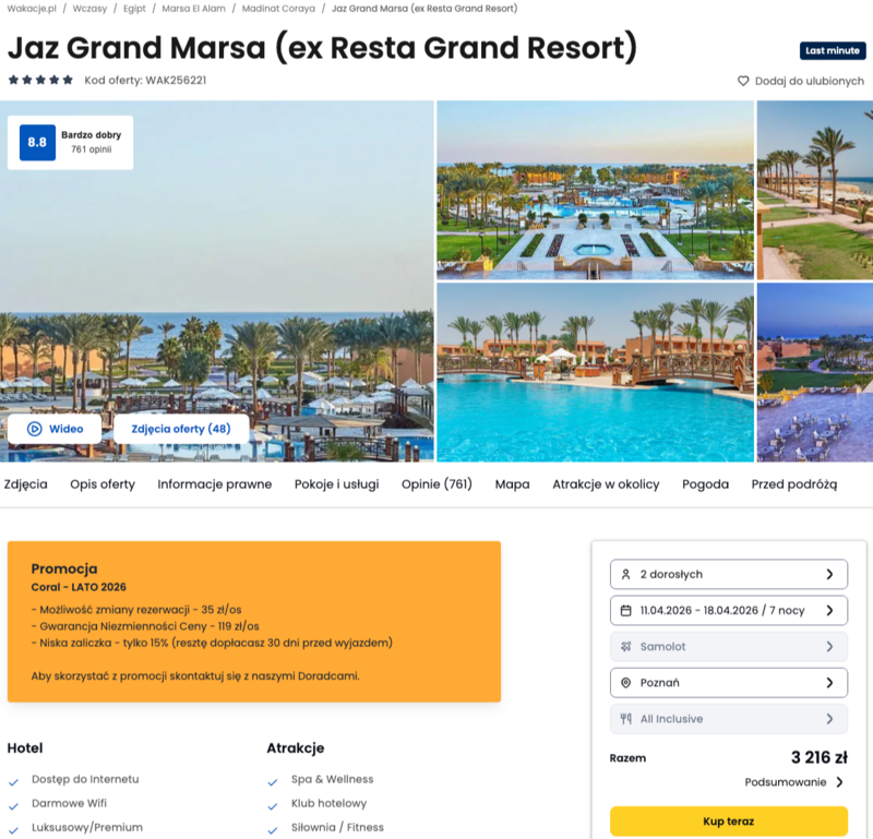 Wybór pada na pięciogwiazdkowy hotel Jaz Grand Marsa, który wśród urlopowiczów cieszy się opinią oazy spokoju. Obiekt położony jest w zadbanym, zielonym ogrodzie bezpośrednio przy prywatnej plaży z pomostem, co sprzyja relaksującym spacerom. Użytkownicy w swoich recenzjach szczególnie chwalą wyśmienitą i różnorodną kuchnię oraz niezwykle uprzejmy personel. Podkreśla się również, że ta oferta jest dostępna w formule all inclusive, co gwarantuje pełen komfort i brak dodatkowych zmartwień o posiłki czy lokalne napoje.