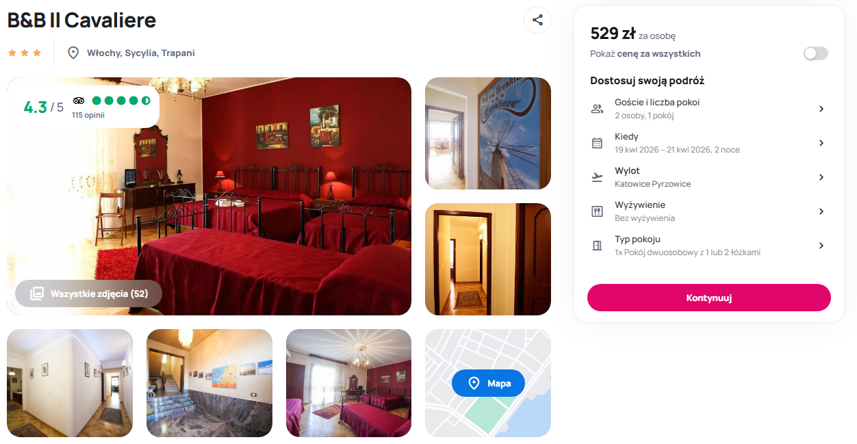 Celem wycieczki będzie Trapani, gdzie w samym centrum miasta czeka bardzo dobrze oceniany pensjonat B&B Il Cavaliere. Podróżni chwalą to miejsce przede wszystkim za świetną atmosferę oraz nienaganną czystość w dźwiękoszczelnych pokojach. Goście w swoich opiniach często wspominają o doskonałej lokalizacji, która pozwala w zaledwie kilkanaście minut dotrzeć do dolnej stacji kolejki linowej prowadzącej do malowniczego miasteczka Erice. Na miejscu można liczyć na wygodne łóżka, dostęp do bezpłatnego Internetu oraz klimatyzację, co jest kluczowe podczas włoskich wypraw.