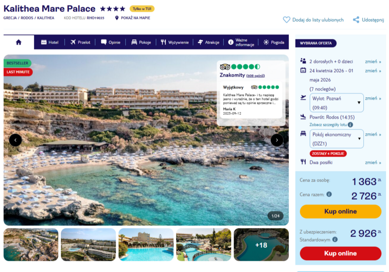 Gości przyjmuje czterogwiazdkowy hotel Kalithea Mare Palace, położony na malowniczym wzgórzu z widokiem na szmaragdową zatokę. Obiekt zachwyca zielonym otoczeniem oraz dostępem do pięknej, prywatnej plaży, która zdaniem odwiedzających stanowi doskonałe miejsce do nurkowania. Użytkownicy chwalą obfite wyżywienie, wspominając o ogromnym wyborze dań mięsnych, owocach morza oraz fontannie z czekoladą, która jest hitem nie tylko wśród najmłodszych. Na miejscu czekają zadbane baseny, kort tenisowy oraz animacje umilające wieczory.