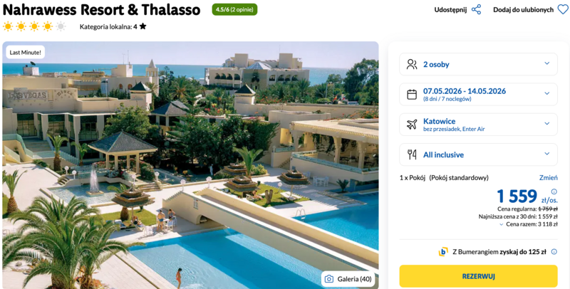 Na miejscu czeka Nahrawess Resort & Thalasso, czterogwiazdkowy obiekt położony niedaleko piaszczystej plaży. Wyjazd ten jest w opcji all inclusive, co zapewnia dostęp do różnorodnych posiłków, od obfitych śniadań po tematyczne buffety z kuchnią włoską czy orientalną. Odwiedzający chwalą świetną lokalizację oraz bogaty program animacyjny i pokazy, które umilają wieczory po dniu spędzonym przy jednym z basenów lub na prywatnym wybrzeżu.