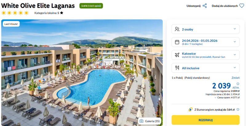 Ten pięciogwiazdkowy obiekt, White Olive Elite Laganas, zachwyca nowoczesną architekturą i wyjątkowym designem, co potwierdzają liczne pozytywne opinie gości. Uczestnicy chwalą przede wszystkim przepyszne jedzenie, czystość zadbanych pokoi oraz niezwykle miłą obsługę. Na miejscu można liczyć na relaks przy dwóch basenach ze słodką wodą lub aktywny wypoczynek w hotelowej siłowni i na boiskach sportowych. Całość wyjazdu realizowana jest w formule all inclusive, która obejmuje nie tylko bogaty bufet śniadaniowy, lunchowy i kolacyjny, ale także szeroki wybór lokalnych napojów i drinków dostępnych od momentu przyjazdu aż do opuszczenia hotelu.