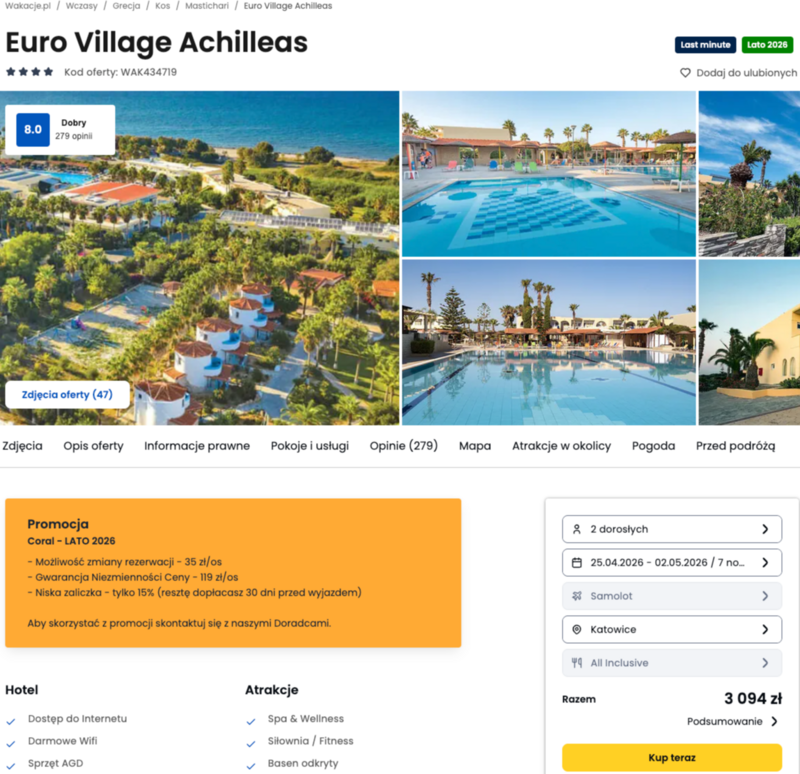 Wybór hotelu Euro Village Achilleas to gwarancja udanego wypoczynku w otoczeniu cedrów i gajów oliwnych. Obiekt zachwyca położeniem bezpośrednio przy piaszczysto-żwirowej plaży oraz bogatą infrastrukturą, w skład której wchodzi duży basen, siłownia i liczne korty tenisowe. Ta wycieczka jest w opcji all inclusive, co pozwala bez ograniczeń korzystać z uroków miejscowej kuchni, serwowanej w restauracjach i barach na terenie całego kompleksu. Goście w swoich opiniach szczególnie chwalą czystość pokoi, wyjątkowo miły personel oraz przepiękne widoki rozpościerające się z hotelowych ogrodów.