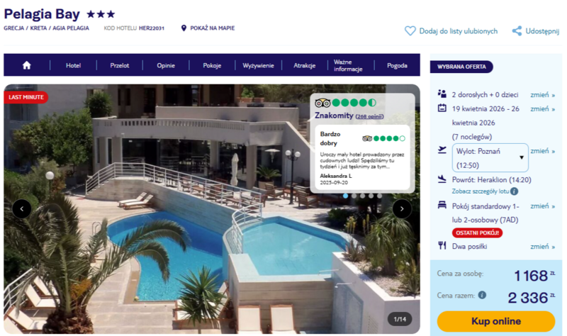 Goście wybierający tę ofertę zatrzymają się w Agia Pelagia, w hotelu Pelagia Bay, który słynie z niezwykle serdecznej, rodzinnej obsługi. Użytkownicy w swoich opiniach często podkreślają, że to właśnie ludzie tworzą tu wyjątkowy klimat, a uśmiechnięty personel dba o każdego przybysza. Z balkonów przestronnych pokoi roztaczają się malownicze widoki na góry i morze, co czyni poranną kawę niezapomnianym przeżyciem. Wielbiciele lokalnej kuchni z pewnością docenią serwowaną na miejscu tradycyjną musakę oraz aromatyczne dania z grilla.