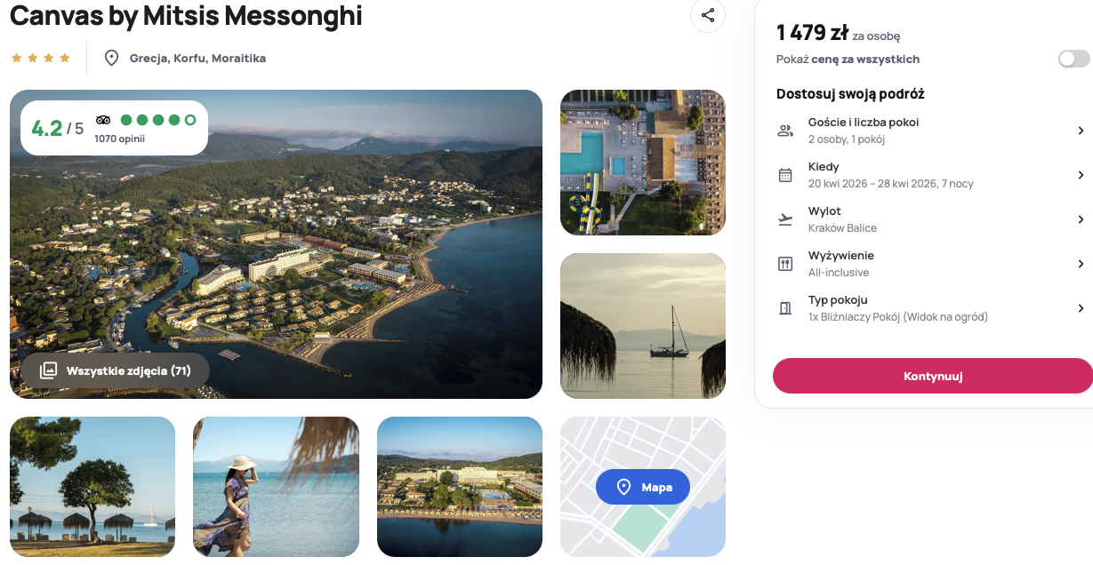 Wczasy w obiekcie Canvas by Mitsis Messonghi na wyspie Korfu to gwarancja najwyższego standardu, co potwierdzają liczne pozytywne opinie gości zachwyconych nowoczesnym designem po generalnym remoncie. Wycieczka w opcji all inclusive pozwala na nielimitowane korzystanie z wykwintnej kuchni śródziemnomorskiej oraz bogatej oferty napojów i przekąsek. Użytkownicy szczególnie chwalą profesjonalny zespół animatorów, który dba o doskonały humor zarówno dzieci, jak i dorosłych.