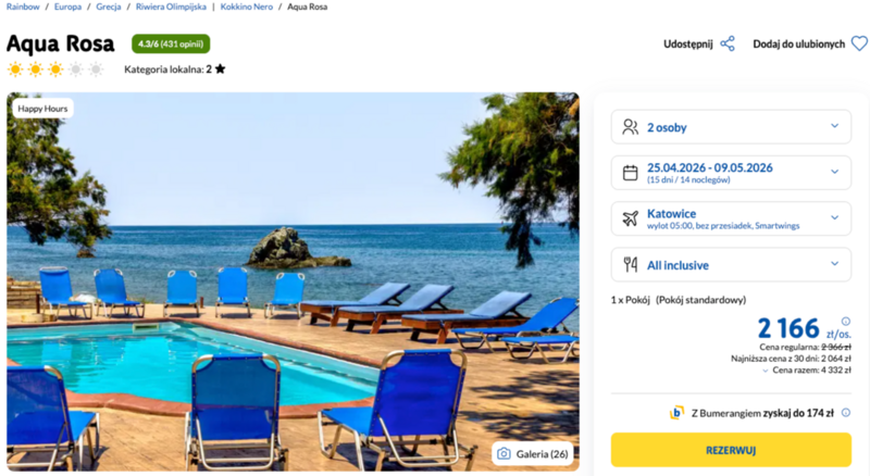 Wyjazd pozwala na relaks w kameralnym hotelu Aqua Rosa, położonym w malowniczej miejscowości Kokkino Nero, bezpośrednio przy brzegu morza. Goście doceniają to miejsce za rodzinną atmosferę oraz niedawno wyremontowane, schludne pokoje. Wycieczka realizowana jest w opcji all inclusive, co gwarantuje pełne wyżywienie w formie bufetu oraz nielimitowany dostęp do lokalnych napojów. Wieczory umilają występy greckich artystów ludowych, wprowadzając biesiadny klimat.