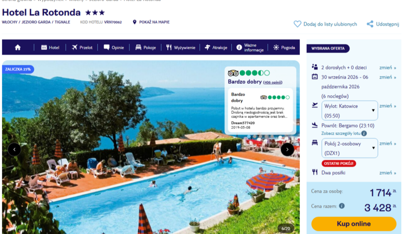 Te włoskie wczasy to idealna okazja, by zatrzymać się w 3* hotelu La Rotonda, usytuowanym na malowniczym zboczu w miejscowości Tignale. Goście szczególnie doceniają zapierające dech w piersiach widoki na okolicę oraz dostęp do basenów, w tym jednego krytego i podgrzewanego. W opiniach użytkowników często pojawiają się zachwyty nad pyszną, lokalną pizzą serwowaną w hotelowej restauracji oraz domowym winem, które umila wieczory na tarasach widokowych. Fani aktywnego wypoczynku mogą skorzystać z siłowni, kortów tenisowych lub wybrać się na wycieczkę do pobliskiej Werony czy Mediolanu.