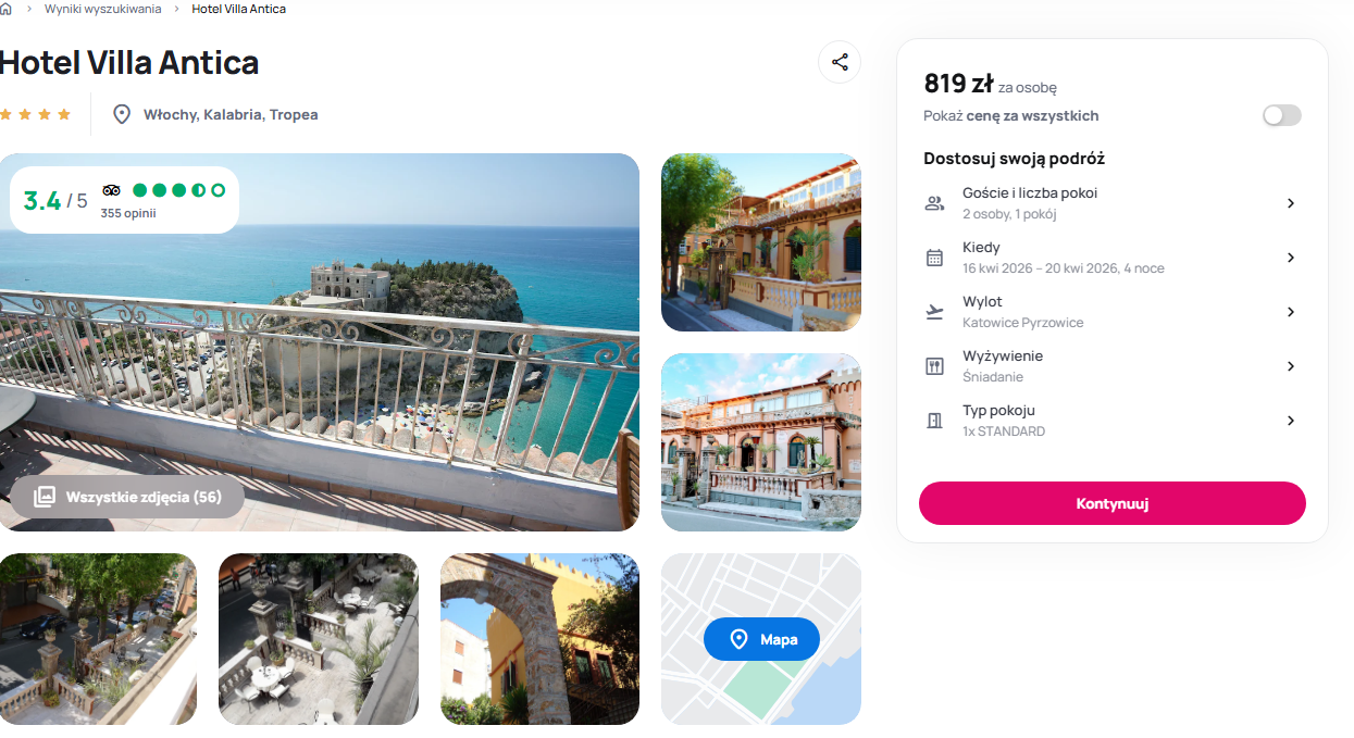 Celem wypoczynku staje się urokliwa Tropea, gdzie w samym centrum miasta czeka 4* Hotel Villa Antica. Ta historyczna willa w stylu belle époque urzeka gości unikalnym wystrojem pokoi, z których niektóre zdobione są oryginalnymi freskami. Odpoczynek umilają śniadania serwowane na dachu z widokiem na okolicę lub w zacisznym ogrodzie pełnym klasycznych posągów. Podróżni w swoich opiniach często podkreślają doskonałą lokalizację obiektu, która pozwala na dotarcie do słynnej katedry normańskiej czy malowniczej plaży w zaledwie kilka minut spacerem.