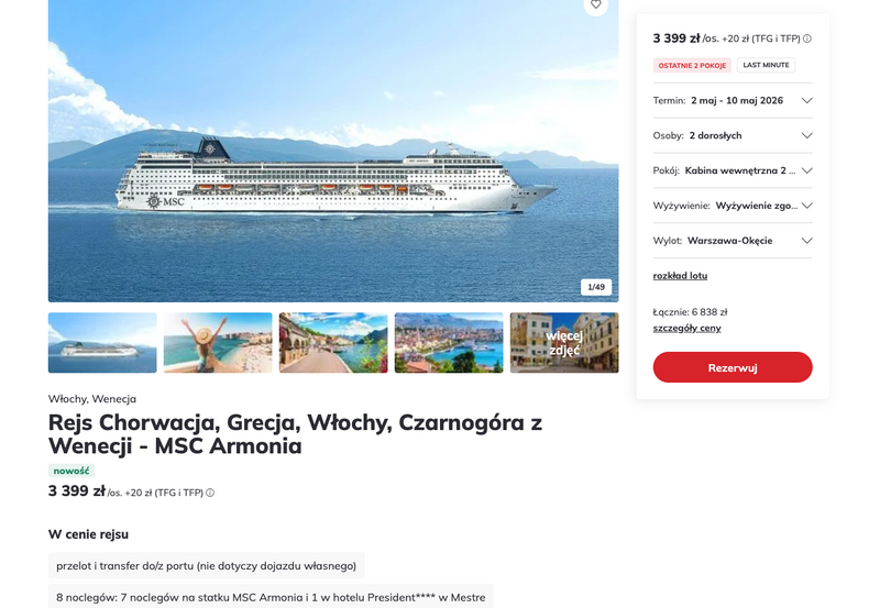 Aktualizacja: Majówka na morzu: Rejs komfortowym statkiem + nocleg w Wenecji + loty z Polski za 2999 zł