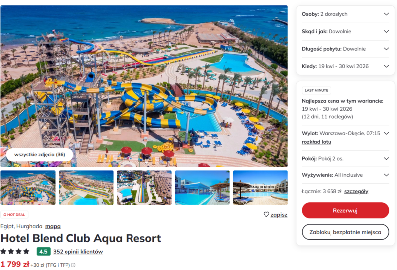 Na miejscu czeka czterogwiazdkowy Hotel Blend Club Aqua Resort, który jest prawdziwym rajem dla miłośników wodnych szaleństw. Obiekt oferuje imponujący park wodny z aż 36 atrakcjami, co czyni go idealnym wyborem na rodzinne wczasy. Goście doceniają w swoich opiniach wyjątkowo smaczne i różnorodne wyżywienie oraz niezwykle pomocną obsługę, która dba o uśmiech każdego odwiedzającego. Wypoczynek odbywa się w formule all inclusive, co pozwala bez ograniczeń korzystać z lokalnych przysmaków oraz napojów w licznych barach, w tym w snack-barze przy zjeżdżalniach.
