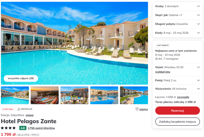Wycieczka do czterogwiazdkowego hotelu Pelagos Zante przyciąga kameralną atmosferą oraz położeniem tuż przy piaszczysto-żwirkowej plaży w miejscowości Tragaki. Goście mogą korzystać z dużego basenu z hydromasażem oraz eleganckich pokoi z widokiem na błękitne morze lub zadbany ogród. Wypoczynek odbywa się w formule all inclusive, co zapewnia nielimitowany dostęp do lokalnych napojów oraz dań kuchni międzynarodowej i greckich przysmaków.