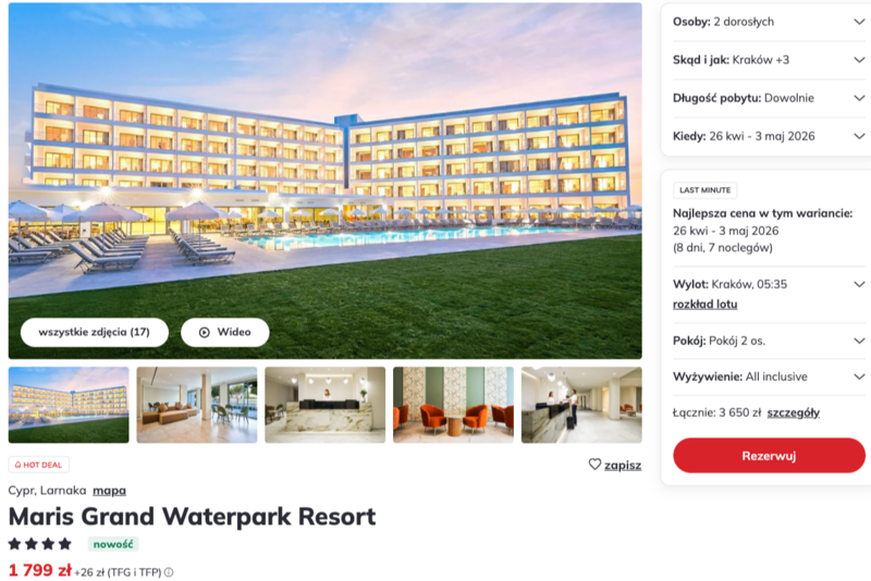 Ten całkowicie odnowiony, czterogwiazdkowy resort w okolicy Protaras zachwyca nowoczesnym stylem i bogatą infrastrukturą. Goście szczególnie chwalą obiekt za fantastyczny park wodny z pięcioma zjeżdżalniami oraz wodny plac zabaw, który jest rajem dla najmłodszych. Na dorosłych czekają eleganckie wnętrza, profesjonalne animacje oraz relaks przy dużym basenie. Całość dopełnia wyśmienita kuchnia serwowana w opcji all inclusive, obejmująca dania międzynarodowe, włoskie przysmaki oraz orzeźwiające napoje w trzech barach.