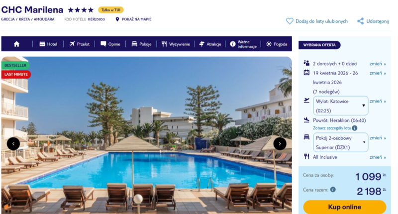 Podróżni w swoich opiniach szczególnie wychwalają hotelowy snack bar, w którym serwowane są pyszne naleśniki oraz wieczorne dania typu gyros. Chwalona jest także gościnność personelu i czystość obiektu. Wybierając ten termin, można liczyć na bardzo przyjemną aurę – temperatura powietrza sięga wówczas 20 stopni Celsjusza, co sprzyja długim spacerom i wycieczkom do pobliskiego pałacu w Knossos. To idealny moment na odpoczynek bez upałów, przy akompaniamencie delikatnego, morskiego szumu.