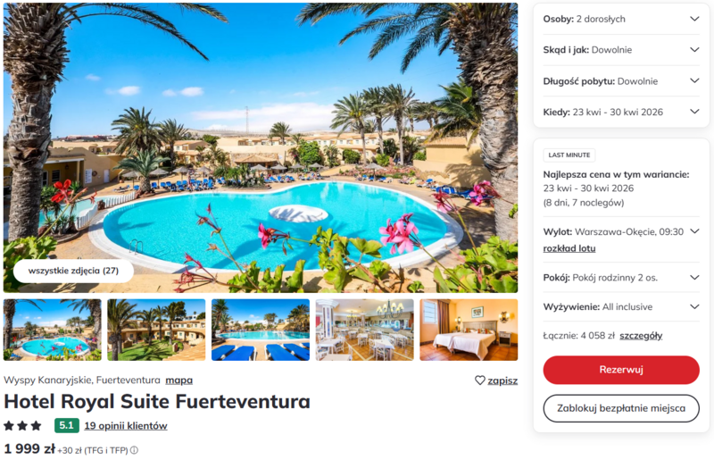 Pobyt w 3* hotelu Royal Suite Fuerteventura zapewnia relaks w otoczeniu tropikalnego ogrodu oraz kameralną, rodzinną atmosferę. Goście chwalą obiekt za nienaganną czystość, niezwykle pomocną obsługę oraz przestronne pokoje. Wycieczka jest oferowana w formule all inclusive, co gwarantuje dostęp do smacznych, lokalnych dań, świeżych owoców oraz innowacyjnych barów samoobsługowych z napojami.