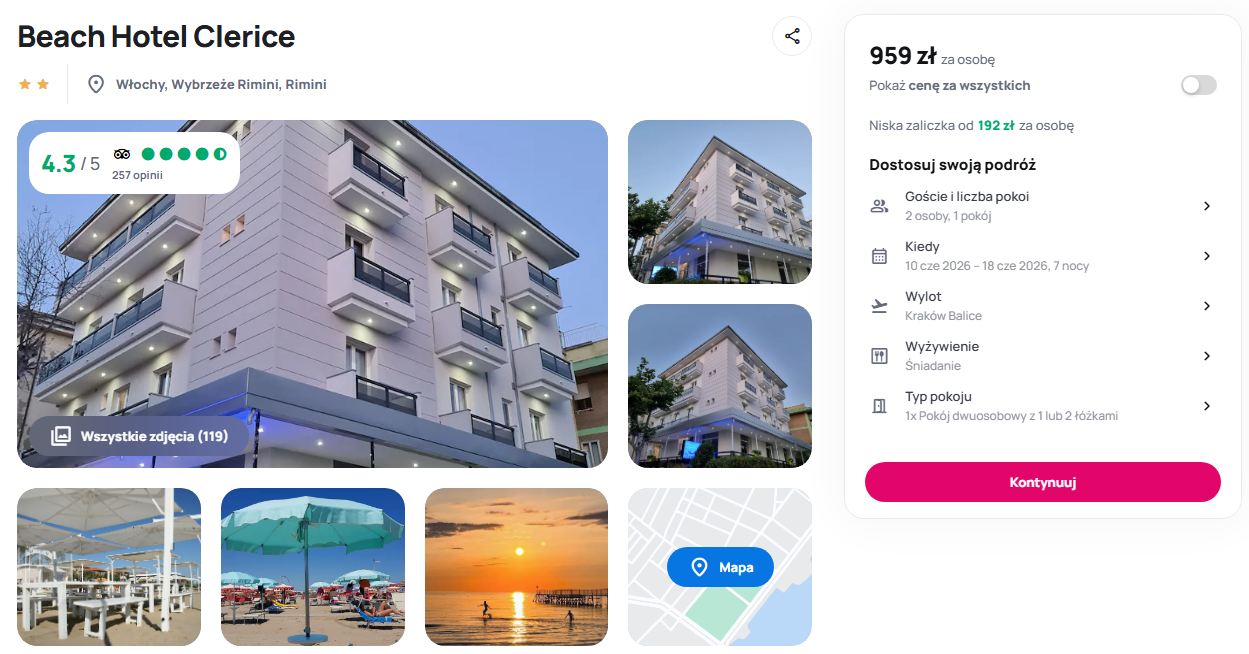 Na miejscu czeka bardzo dobrze oceniany Beach Hotel Clerice, położony w urokliwej dzielnicy Bellariva, zaledwie kilka minut spacerem od piaszczystego wybrzeża. Goście doceniają obiekt za rodzinną atmosferę, codzienne sprzątanie pokoi oraz pomocną obsługę, która chętnie doradza w organizacji lokalnych wycieczek. Pokoje wyposażone są w klimatyzację i balkony, a poranki umila śniadanie serwowane w formie bufetu. Podróżni w swoich opiniach często podkreślają, że standard hotelu pozytywnie zaskakuje, a bliskość barów i restauracji pozwala w pełni poczuć klimat włoskich wakacji.