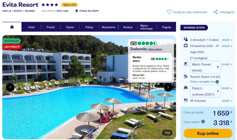 Wyjazd do czterogwiazdkowego hotelu Evita Resort w pobliżu miejscowości Faliraki gwarantuje relaks w spokojnej okolicy. Obiekt cieszy się znakomitymi opiniami gości, którzy szczególnie chwalą angażujący program animacyjny przygotowany przez profesjonalny zespół oraz smaczną pizzę serwowaną w barze z przekąskami. Pokoje są przestronne i regularnie sprzątane, co zapewnia wysoki komfort pobytu. Całość wycieczki realizowana jest w wygodnej formule all inclusive, obejmującej pełne wyżywienie oraz lokalne napoje.