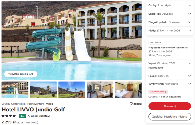 Wczasy w miejscowości Jandia to raj dla spacerowiczów i miłośników sportów wodnych. Użytkownicy w swoich opiniach zachwalają urokliwe ścieżki prowadzące do szerokich plaż Morro Jable oraz krystalicznie czystą wodę oceanu. Na miejscu na aktywnych czekają dwa baseny, zjeżdżalnie oraz siłownia. Wieczory umilają ciekawe programy animacyjne dla dorosłych i dzieci. To idealne miejsce, aby odetchnąć od codzienności i poczuć prawdziwy klimat Wysp Kanaryjskich, korzystając z pełnych przywilejów wyżywienia all inclusive.