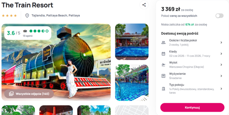 Pobyt zaplanowano w czterogwiazdkowym obiekcie The Train Resort, który przyciąga unikalną architekturą nawiązującą do pociągu parowego. Goście doceniają to miejsce za przestronne pokoje z aneksami kuchennymi oraz spokojną atmosferę, idealną do regeneracji sił. Na terenie ośrodka do dyspozycji pozostaje pełne spa, centrum fitness oraz relaksujące baseny, w tym specjalny brodzik dla najmłodszych. Użytkownicy w swoich opiniach często podkreślają, że jest to doskonała baza wypadowa do zwiedzania okolicznych atrakcji, takich jak słynny deptak w Pattayi czy malowniczy pływający targ.