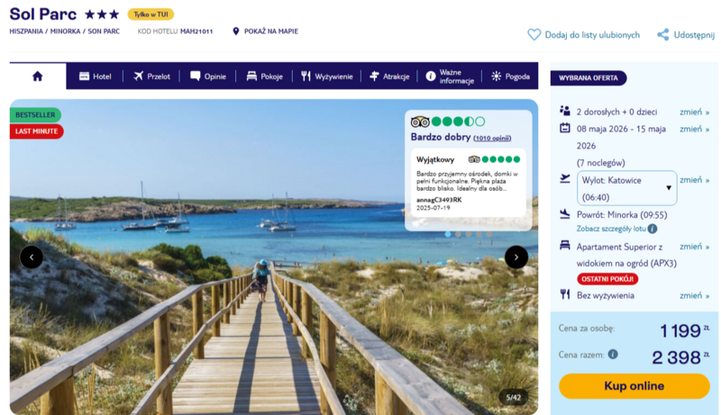W ramach tej propozycji możesz liczyć na zakwaterowanie w 3* obiekcie Sol Parc, który jest malowniczo położony pośród lasu sosnowego. Budynki otoczone są naturalnym krajobrazem, a dojście do wybrzeża prowadzi przez urokliwy, kilkusetmetrowy drewniany pomost nad wydmami. Plaże w tej części Minorki zachwycają czystością, płytkim wejściem do morza i turkusową wodą, co w opiniach gości regularnie pojawia się jako największy atut okolicy. Podróżni chwalą również obecność basenów ze zjeżdżalniami oraz dobrze wyposażone apartamenty z aneksami kuchennymi, zapewniające pełną swobodę.