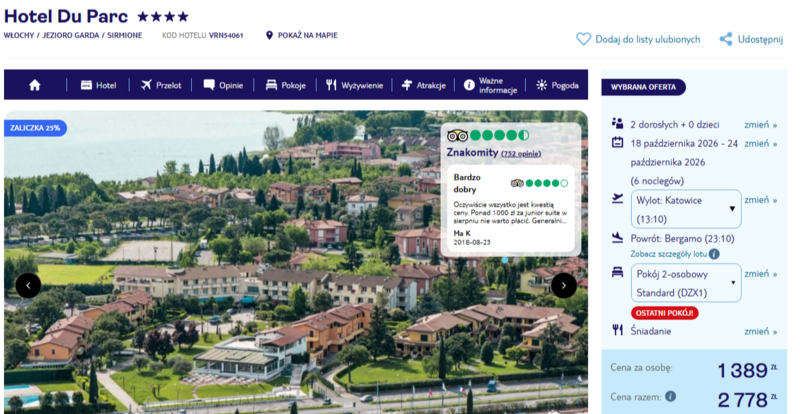 Pobyt przewidziano w 4* hotelu Du Parc, położonym w malowniczej miejscowości Sirmione. Obiekt cieszy się znakomitymi opiniami gości, którzy doceniają wyjątkową czystość, przytulny basen oraz bardzo bliską odległość od brzegu jeziora. Podróżni zwracają uwagę na miłą obsługę i komfortowe pokoje, które spełniają oczekiwania zarówno par, jak i rodzin z dziećmi. Do dyspozycji wypoczywających pozostaje strefa spa oraz jacuzzi, co sprzyja pełnemu odprężeniu.