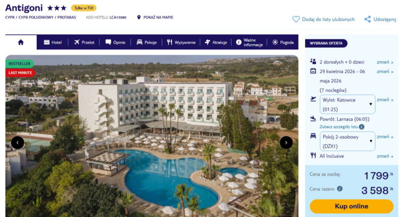 Goście wybierający 3* hotel Antigoni mogą liczyć na wypoczynek w samym sercu tętniącej życiem miejscowości Protaras. Obiekt cieszy się dobrymi opiniami dzięki świetnej lokalizacji blisko tawern i barów oraz urozmaiconym animacjom dla dorosłych i dzieci. Na miejscu czekają trzy baseny, w tym jeden kryty, a także korty tenisowe i siłownia. Całość wyjazdu uatrakcyjnia wygodna formuła wyżywienia all inclusive, która obejmuje nie tylko bufety z daniami kuchni międzynarodowej, ale również lody i przekąski serwowane do późnych godzin wieczornych.