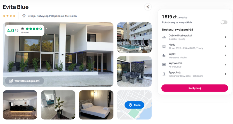 Wycieczka do czterogwiazdkowego hotelu Evita Blue na Półwyspie Peloponeskim to idealny sposób na odpoczynek. Obiekt usytuowany jest blisko Zatoki Korynckiej, co gwarantuje wspaniałe widoki na krystaliczne wody Morza Jońskiego. Goście doceniają to miejsce za wyjątkową czystość, przestronne, klimatyzowane pokoje z balkonami oraz niezwykle pomocną obsługę. Wypoczynek umila fakt, że ta wycieczka jest w opcji all inclusive, co pozwala na nielimitowane korzystanie z lokalnych specjałów i drinków w hotelowej restauracji oraz barze.