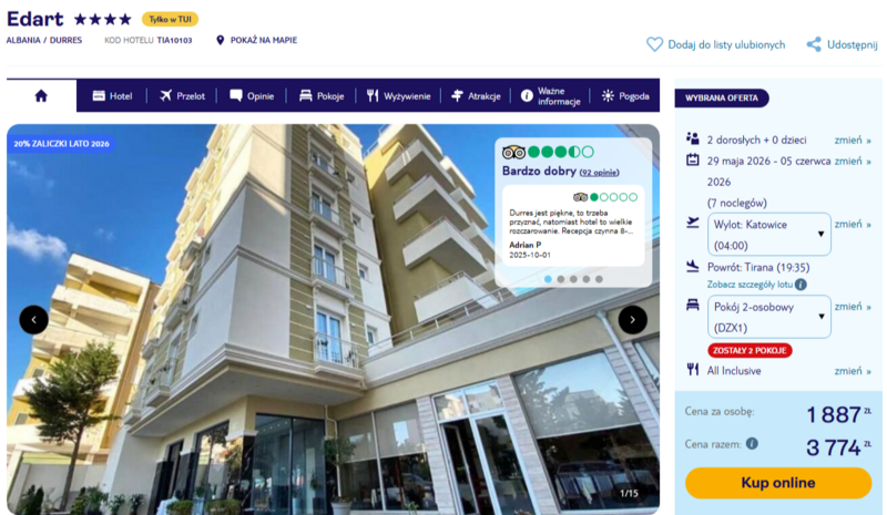Podróżni doceniają ten obiekt za czystość oraz niezwykle miłą i pomocną obsługę, która dba o rodzinną atmosferę. Wolny czas warto poświęcić na odkrywanie uroków okolicy, wybierając się na wycieczkę do pobliskiej Tirany lub historycznej Krui. Durrës również ma do zaoferowania zabytki i bałkański klimat, a wieczorne spacery brzegiem Adriatyku stanowią doskonałe dopełnienie urlopu. To świetny wybór dla osób szukających kameralnego miejsca na wypoczynek w opcji all inclusive.