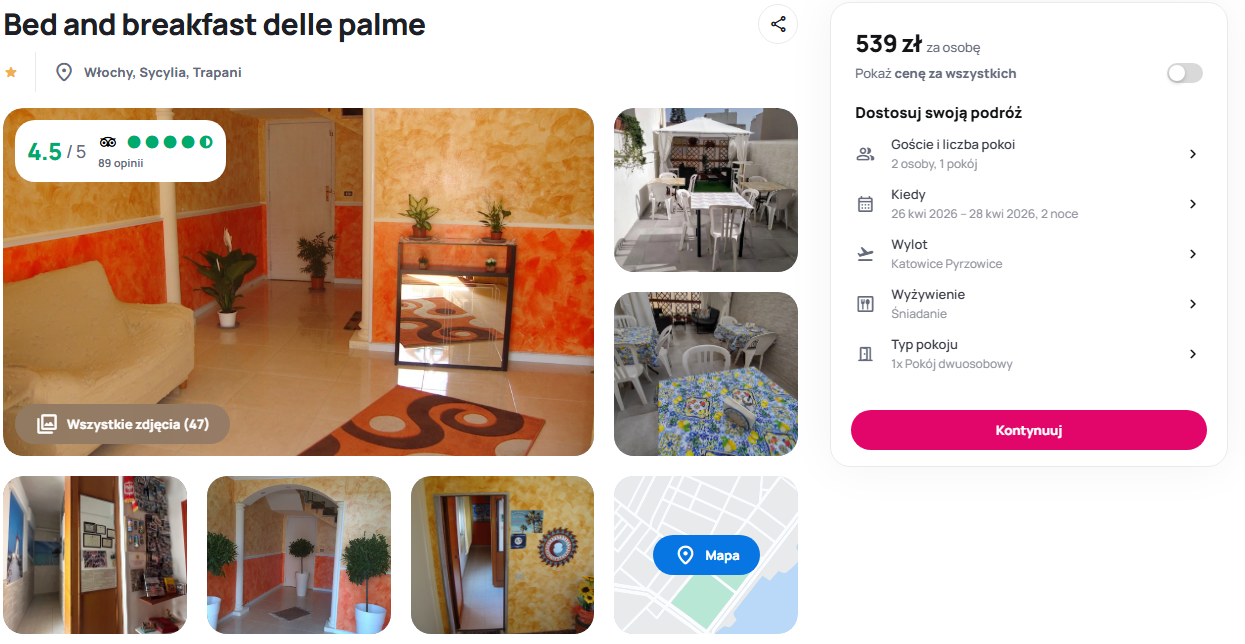 Podróż do Trapani pozwala na relaks w kameralnym pensjonacie Bed and breakfast delle palme, który cieszy się bardzo dobrymi opiniami gości. Odwiedzający chwalą to miejsce za niezwykle przyjazną, domową atmosferę oraz pyszne śniadania, podczas których serwowane są świeże bułeczki, lokalne wędliny i owoce. Podróżni podkreślają, że pensjonat stanowi świetną bazę wypadową do zwiedzania okolicy, a dostępność rowerów ułatwia dotarcie do najważniejszych punktów miasta.