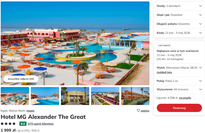 Urlop spędza się w komfortowym, czterogwiazdkowym hotelu MG Alexander The Great, który jest położony bezpośrednio przy prywatnej, piaszczystej plaży. Obiekt zachwyca rozległym terenem oraz swobodną atmosferą, co czyni go idealnym wyborem dla osób pragnących naładować baterie. Na miejscu czeka bogata propozycja rekreacyjna, obejmująca baseny, kort tenisowy oraz niezwykle cenioną przez gości rafę koralową dostępną prosto z pomostu. Podkreśla się, że wczasy odbywają się w wygodnej opcji all inclusive, obejmującej urozmaicone posiłki kuchni międzynarodowej oraz lokalne napoje.
