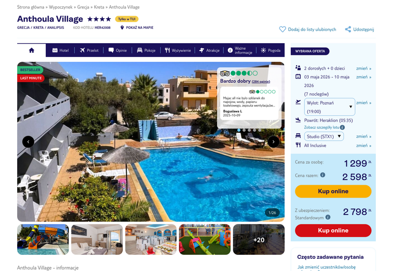 Wiosenny termin to doskonały moment na zwiedzanie starożytnego pałacu w Knossos czy spacerowanie długą promenadą w pobliskim Hersonisos. Grecja w tym czasie wita przyjezdnych bardzo przyjemną aurą – temperatura powietrza oscyluje wokół 24 stopni Celsjusza, co sprzyja zarówno kąpielom słonecznym przy hotelowym basenie, jak i aktywnym wycieczkom po wyspie. Użytkownicy cenią to miejsce jako świetną bazę wypadową do odkrywania uroków Krety, a dzięki opcji all inclusive każdy dzień zaczyna się od pożywnego śniadania z widokiem na błękitne niebo.
