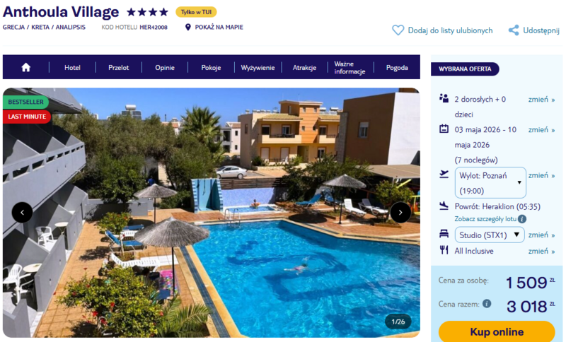 Wiosenny termin to doskonały moment na zwiedzanie starożytnego pałacu w Knossos czy spacerowanie długą promenadą w pobliskim Hersonisos. Grecja w tym czasie wita przyjezdnych bardzo przyjemną aurą – temperatura powietrza oscyluje wokół 24 stopni Celsjusza, co sprzyja zarówno kąpielom słonecznym przy hotelowym basenie, jak i aktywnym wycieczkom po wyspie. Użytkownicy cenią to miejsce jako świetną bazę wypadową do odkrywania uroków Krety, a dzięki opcji all inclusive każdy dzień zaczyna się od pożywnego śniadania z widokiem na błękitne niebo.