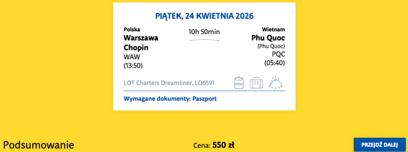 Bezpośrednie połączenie czarterowe z Warszawy na egzotyczną wyspę Phú Quốc stanowi doskonałą okazję do zaplanowania podróży do Azji Południowo-Wschodniej. Rejs startuje z Lotniska Chopina w godzinach popołudniowych, co pozwala na komfortowe dotarcie do portu lotniczego z różnych części kraju przed rozpoczęciem tej dalekiej wyprawy.