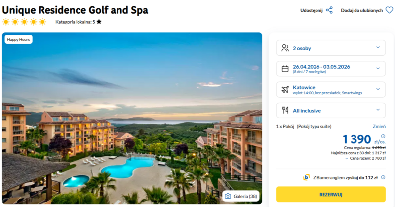 Wybór hotelu Unique Residence Golf and Spa to gwarancja wypoczynku na najwyższym poziomie, co potwierdzają liczne pozytywne opinie gości doceniających nowoczesne apartamenty oraz aż jedenaście dostępnych basenów. Obiekt usytuowany na malowniczych, zielonych wzgórzach w okolicach miejscowości Kusadasi oferuje bogaty program animacyjny, profesjonalne pole golfowe oraz relaksującą strefę spa z darmową łaźnią turecką i sauną. Wyjazd jest organizowany w formule all inclusive, która obejmuje nie tylko urozmaicone bufety w restauracji głównej i nocne przekąski, ale także orzeźwiające napoje w licznych barach oraz tradycyjne placki w restauracjach tematycznych.