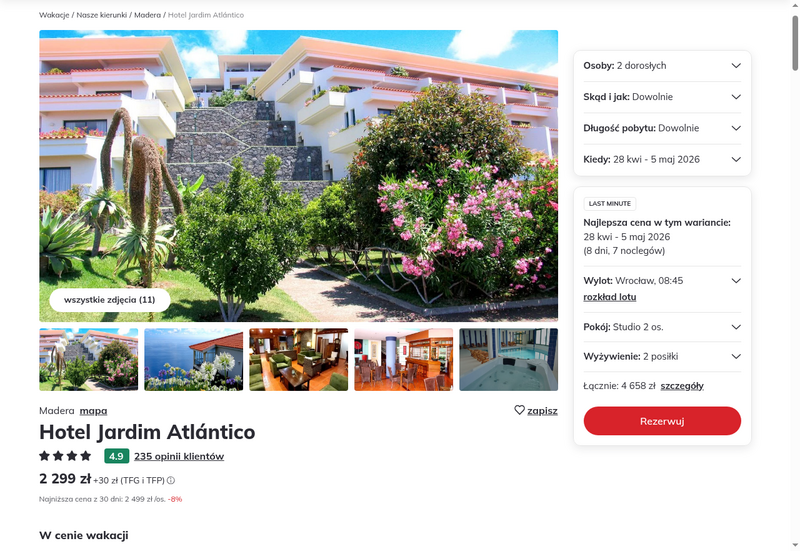 Wypoczynek w czterogwiazdkowym hotelu Jardim Atlantico to propozycja dla osób pragnących ucieczki od zgiełku miasta. Obiekt usytuowany jest na malowniczym klifie w miejscowości Prazeres, co gwarantuje zapierające dech w piersiach widoki na Ocean Atlantycki oraz górzyste krajobrazy. Uczestnicy wyjazdów często chwalą to miejsce za niezwykły spokój, profesjonalną obsługę oraz smaczną regionalną kuchnię bogatą w świeże ryby i egzotyczne owoce. Przestronne studia z aneksami kuchennymi zapewniają dużą swobodę, a dostęp do krytego basenu i jacuzzi pozwala na pełną regenerację.