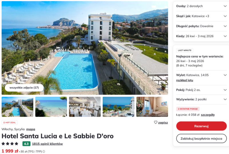 Podczas tych wczasów goście zatrzymają się w czterogwiazdkowym hotelu Santa Lucia e Le Sabbie D'oro, malowniczo położonym niedaleko urokliwego miasteczka Cefalù. Użytkownicy w swoich opiniach szczególnie cenią zapierające dech w piersiach widoki na morze oraz majestatyczną skałę La Rocca, którą można podziwiać prosto z zadbanego basenu. Spacer nadmorską promenadą do zabytkowego centrum zajmuje jedynie dwadzieścia minut, co pozwala na codzienne odkrywanie włoskich smaków w lokalnych restauracjach.