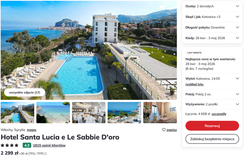 Podczas tych wczasów goście zatrzymają się w czterogwiazdkowym hotelu Santa Lucia e Le Sabbie D'oro, malowniczo położonym niedaleko urokliwego miasteczka Cefalù. Użytkownicy w swoich opiniach szczególnie cenią zapierające dech w piersiach widoki na morze oraz majestatyczną skałę La Rocca, którą można podziwiać prosto z zadbanego basenu. Spacer nadmorską promenadą do zabytkowego centrum zajmuje jedynie dwadzieścia minut, co pozwala na codzienne odkrywanie włoskich smaków w lokalnych restauracjach.