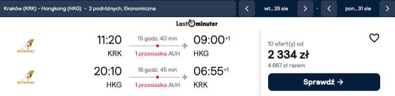 Ta propozycja przelotu w obie strony pozwala zaplanować niezapomniane wakacje u schyłku lata. Podróż odbywa się na pokładzie cenionych linii lotniczych Etihad Airways, co gwarantuje wysoki komfort oraz sprawną przesiadkę w porcie Zayed International. Całkowity czas przelotu wynosi około szesnastu godzin, co jest doskonałym wynikiem na trasie łączącej Europę z dalekowschodnią Azją.