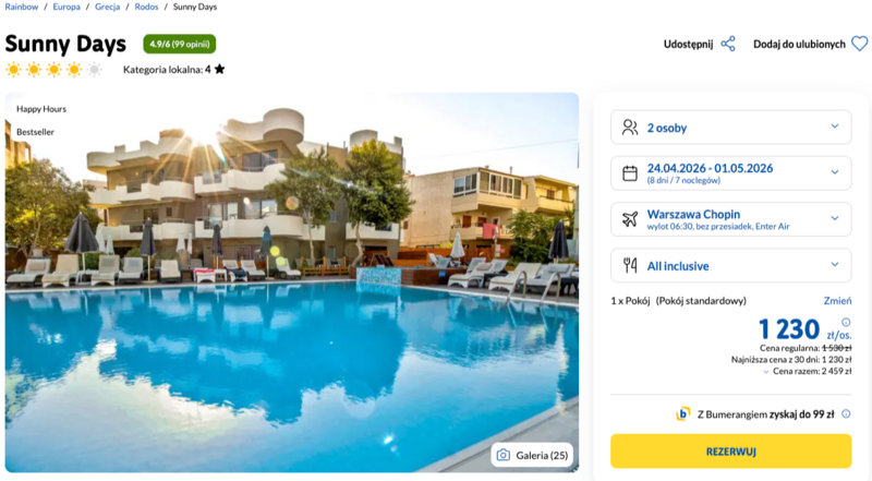 Zakwaterowanie w czterogwiazdkowym hotelu Sunny Days gwarantuje wysoki komfort oraz nowoczesny, jasny wystrój wyremontowanych pokoi. Wycieczka odbywa się w formule all inclusive, co zapewnia pełne wyżywienie w restauracji głównej oraz dostęp do orzeźwiających napojów i koktajli w barze przy basenie. Goście szczególnie chwalą doskonałą obsługę, w tym pomocny personel. Użytkownicy w swoich opiniach podkreślają wysoką jakość jedzenia, wskazując na wyśmienite lokalne przysmaki, takie jak kalmary czy dolmades, oraz klimatyczne wieczory z muzyką na żywo.