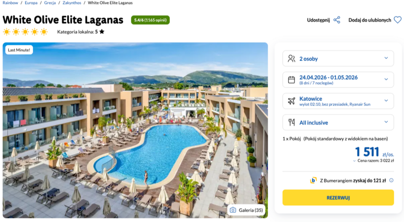 Wczasy w obiekcie White Olive Elite Laganas to gwarancja wysokiego standardu, co potwierdzają liczne pozytywne opinie gości, zachwalający czystość pokoi oraz niezwykle miłą obsługę. Ten nowoczesny, pięciogwiazdkowy hotel zapewnia gościom relaks w dwóch basenach, dostęp do profesjonalnej siłowni oraz bogaty program animacyjny. Wielkim atutem jest położenie niedaleko piaszczystej plaży, będącej miejscem lęgowym słynnych żółwi Caretta Caretta. Cały wyjazd odbywa się w formule all inclusive, obejmującej pełne wyżywienie w formie bufetu oraz szeroki wybór napojów, dostępnych od momentu przybycia aż do opuszczenia hotelu.