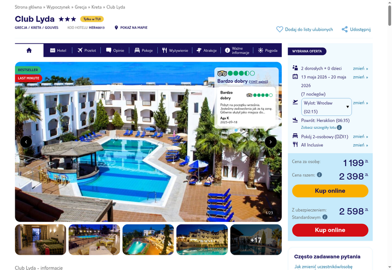 Te wyjątkowe wczasy to idealna okazja, aby zaznać greckiej gościnności w trzygwiazdkowym obiekcie Club Lyda. Kompleks położony jest w spokojnej okolicy, co czyni go świetną bazą wypadową do zwiedzania Knossos czy pobliskiego Heraklionu. Goście doceniają przede wszystkim niezwykle pomocną, uśmiechniętą obsługę oraz obecność polskojęzycznego personelu, który zawsze służy dobrą radą. Na miejscu można korzystać z kilku basenów oraz urokliwego ogrodu, a spragnieni morskich kąpieli mogą udać się na spacer do pobliskiej plaży w Gouves lub skorzystać z wygodnego hotelowego busa.