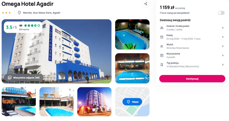 Ten wyjazd to idealna okazja, aby poczuć klimat marokańskiego wybrzeża, zatrzymując się w Omega Hotel Agadir. Obiekt, położony blisko złocistej plaży oraz tętniącego życiem bazaru Suk al-Ahad, oferuje gościom trzy posiłki dziennie, klimatyzowane pokoje oraz dostęp do basenu z barem. Osoby odwiedzające to miejsce w swoich opiniach często chwalą niezwykle miłą i pomocną obsługę, czystość oraz pięknie zdobione wnętrza, które oddają lokalny charakter.