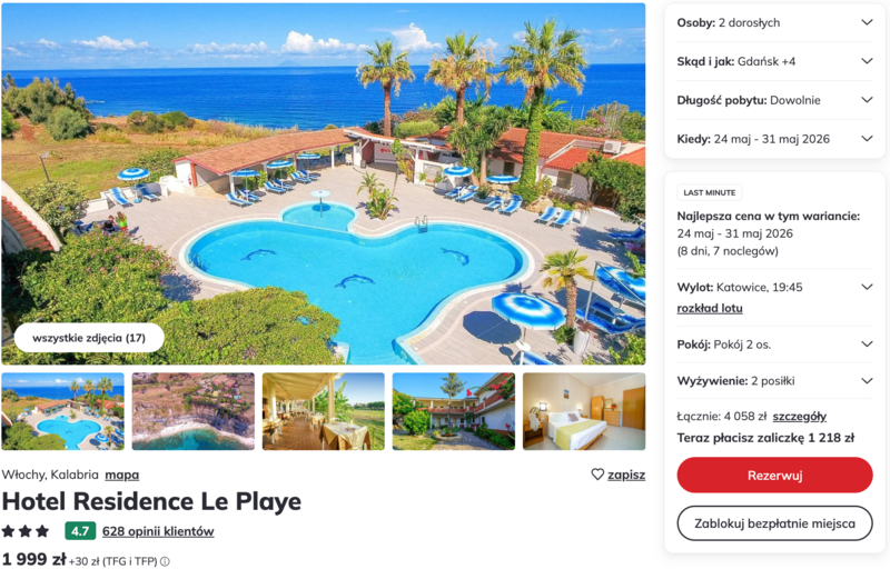 Te wyjątkowe wczasy to idealna propozycja dla osób pragnących relaksu w kameralnej atmosferze. Hotel Residence Le Playe, położony na malowniczym siedemdziesięciometrowym klifie, zachwyca gości przepięknymi zachodami słońca z widokiem na Wyspy Eolskie. Odpoczynek umila zadbany ogród z małym warzywnikiem, w którym można spróbować lokalnych owoców. Użytkownicy chwalą obiekt za czystość, niezwykle uprzejmą obsługę oraz świetną bazę wypadową do zwiedzania pobliskiej Tropei czy Pizzo dzięki bliskości stacji kolejowej.