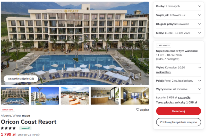 Na miejscu czeka nowoczesny, czterogwiazdkowy hotel Oricon Coast Resort, położony w malowniczej okolicy niedaleko Wlory. Obiekt zachwyca widokami na góry i morze, a goście w swoich opiniach często chwalą stylowe pokoje oraz serdeczną obsługę. Do dyspozycji wypoczywających oddano trzy baseny, w tym specjalną strefę dla dzieci, oraz profesjonalną siłownię. Całość wyjazdu uświetnia bogata oferta all inclusive, dzięki której można bez ograniczeń delektować się lokalną kuchnią oraz orzeźwiającymi napojami serwowanymi w barach.